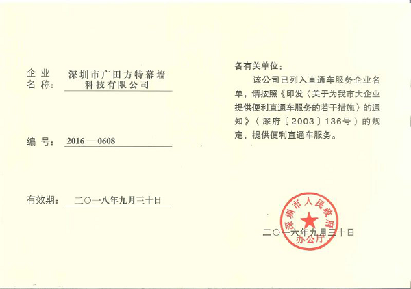 近日,广田方特在荣获中国建筑幕墙行业百强,建筑装饰综合实力百强殊荣,“2015年度广东省守合同重信用企业”称号后,2016年底又再次荣获深圳市大企业便利直通车服务的邀请!真是可喜可贺!