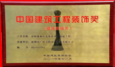 广田方特承建的“漳州奥林匹克体育中心幕墙”工程,荣获2015年~2016年度“中国建筑工程装饰奖”(建筑幕墙类),证书编号为:ZJ1652091。