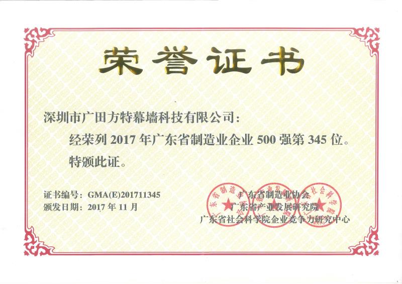 近日,我司荣获2017年广东省制造业500强企业,排名第345位。