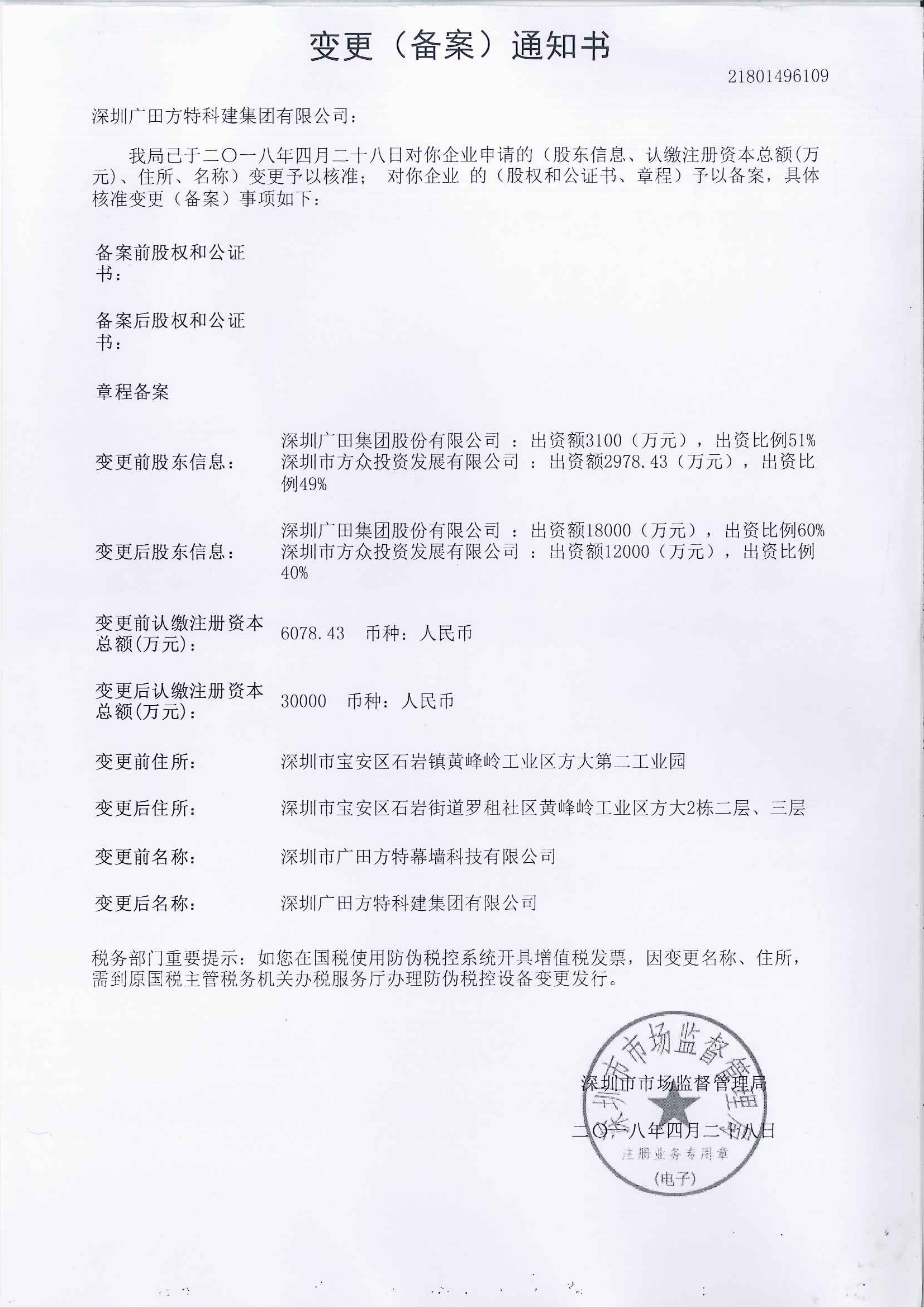 非常感谢一直以来对我司的大力支持,为了适应市场及公司战略发展的需要,经上级集团及公司董事会研究决定并经深圳市市场监督管理局核准,我司原名称“深圳市广田方特幕墙科技有限公司”从2018年4月28日起变更登记为“深圳广田方特科建集团有限公司”。从变更之日起,公司以“深圳广田方特科建集团有限公司”对外开展经营活动,公司所有对内及对外文件、资料、开据发票、账号、税号等全部使用新公司名称。